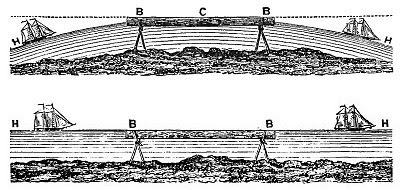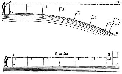 63)彼の2つ目の実験ですが、5フィート(1.524m)の旗印を海岸線沿いに1マイルごとに設置しました。それで望遠鏡を最初の旗印より5フィート後ろに設置しましたが、6本すべての旗印の上部分が完璧に真っ直ぐに並列している事実を観ました。もし地球の周辺が25000マイルなら、旗印はそれぞれ最初のものから徐々に沈んでいくはずであり、2番目は8インチ(20.32cm)沈んでいて、3番目は32インチ(81.28cm)、4番目は6フィート(1.8288m)、5番目は10フィート8インチ(3.251m)、6番目は16フィート8インチ(5.08m)の曲率外観になるはずです。