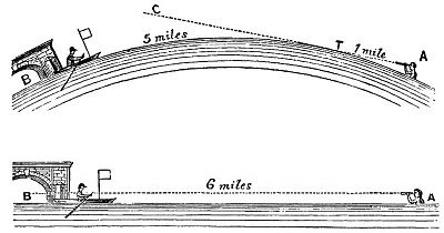 62)Samuel Rowbotham(サミュエル・ロボーサム)によるイングランドのベッドフォード川での実験ですが、運河の水流は決定的に6マイル(9.65606km)の渡って完璧にフラットです。まず、水上から8インチ(20.32cm)に望遠鏡を設置して運河に立ち構えて、彼の友人が5フィートの旗をボートに取り付けて6マイルほど向こうに遠ざかりました。もし、地球が25000(40233.6km)マイルの周辺を伴う球体であるなら、6マイルの長い川は真ん中で6フィート(1.8288m)高い弧を構成するはずであり、そのために全体のボートと旗は消えたように見えるはずです。しかし、事実は異なり、全体のボートと旗は長い距離を隔てても常に同じ高さにはっきり見えました。