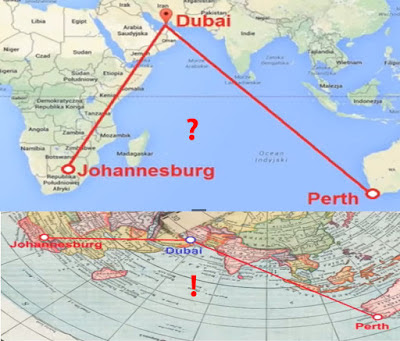45)球体モデルにおいて、南アフリカのヨハネスブルグ市からオーストラリアのパースに行きたいなら、インド洋を渡って、燃料補充をするにしてもモーリシャスかマダガスカルが好ましく最短ルートです。しかし、実際の飛行ルートでは、奇妙なことにドバイか香港かマレーシアのいずれかに途中降機し、球体モデルでは意味を成しませんが、フラットアース上ではよく辻褄が合います。